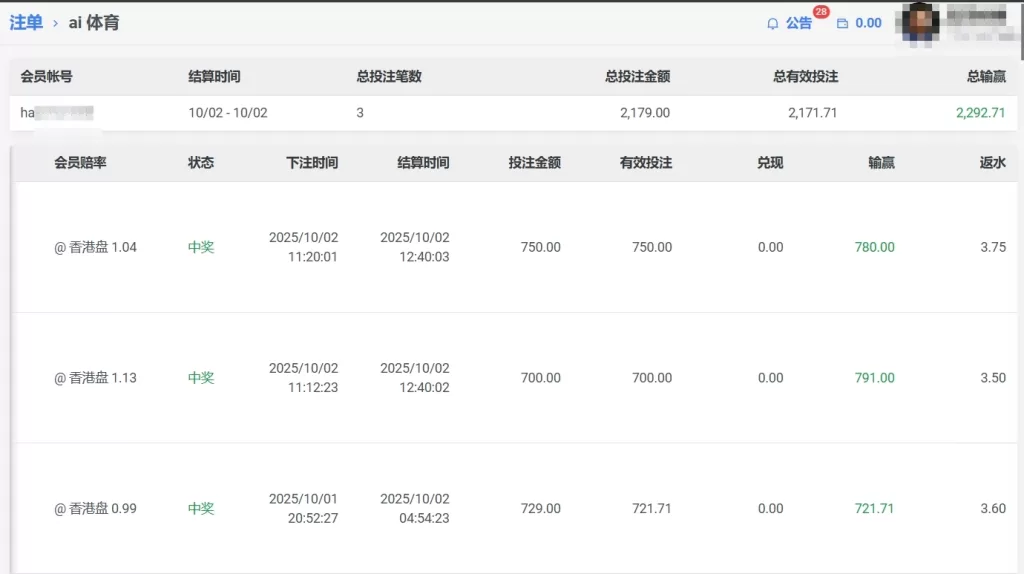 • ai 体育会員ha**** 篮球 单日盈利22922025年10月2日