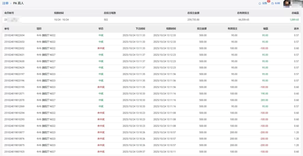 PA 真人会員23**** 牛牛 单日盈利1089