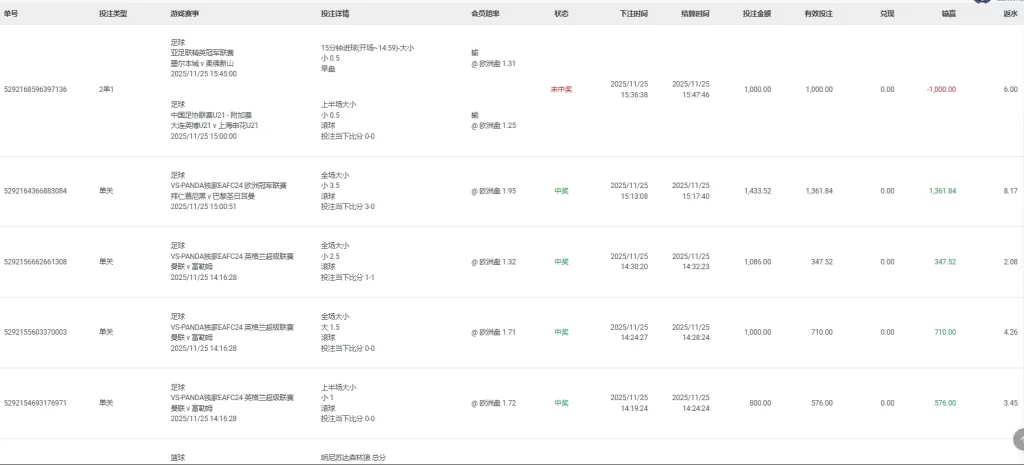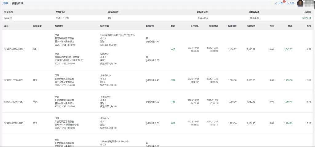 熊猫体育 会員wing**** 足球 单日盈利10070