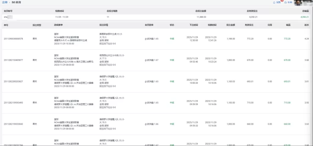 IM 体育 会員sha**** 篮球 单日盈利4350