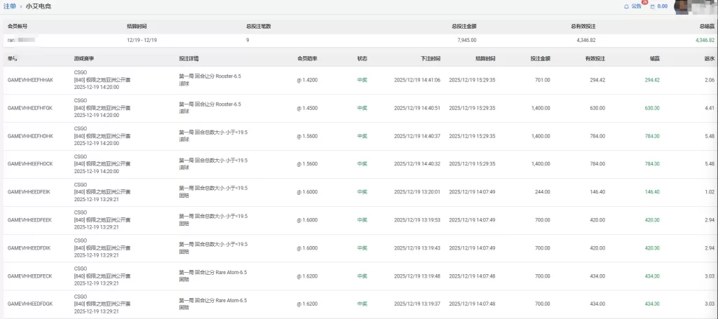 小艾电竞 会員ran**** 滚求 单日盈利4346