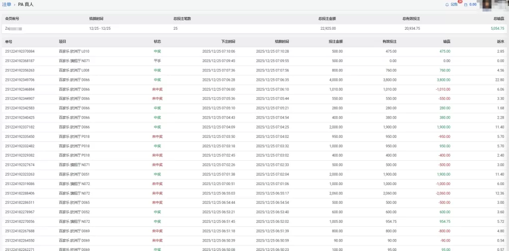 PA 真人会員Zxj**** 百家 单日盈利5054