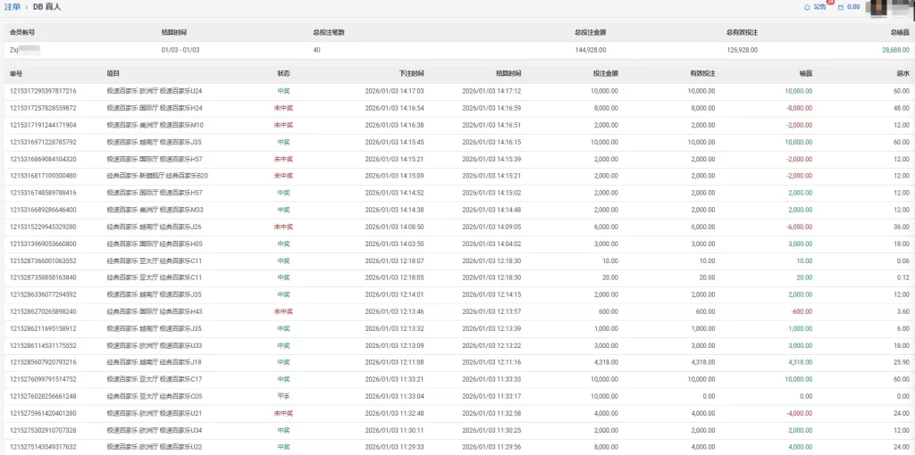 DB 真人 会員Zxj**** 百家 单日盈利28688