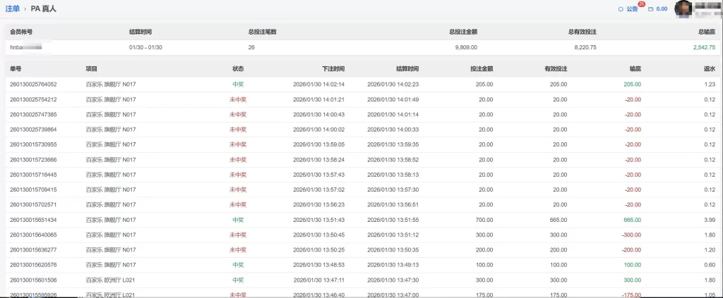 PA 真人 会員hnba**** 百家 单日盈利2542