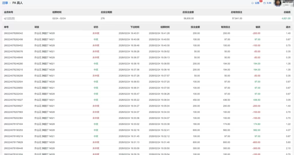 PA 真人 会員cj**** 炸金花 单日盈利4621