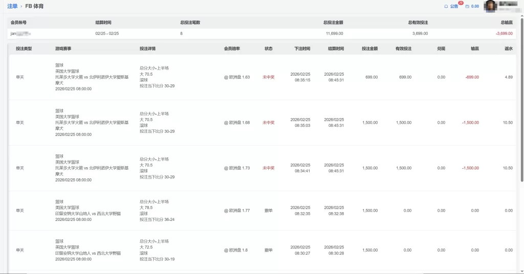 FB 体育 会員jan**** 篮求 单日虧損3699