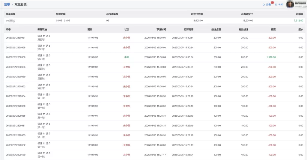 双赢彩票 会員wa**** 极速 单日盈利7512