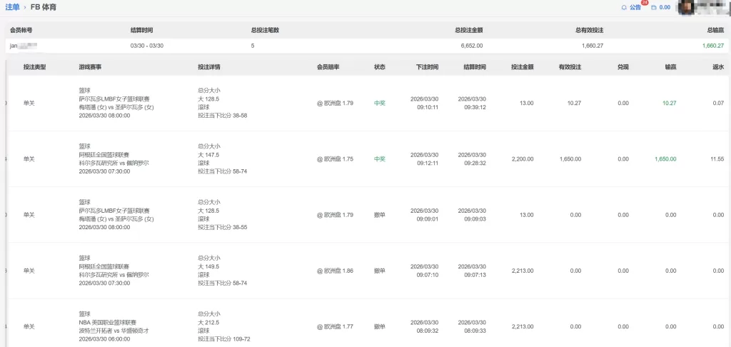 FB体育 会員jan**** 百家 单日盈利1660