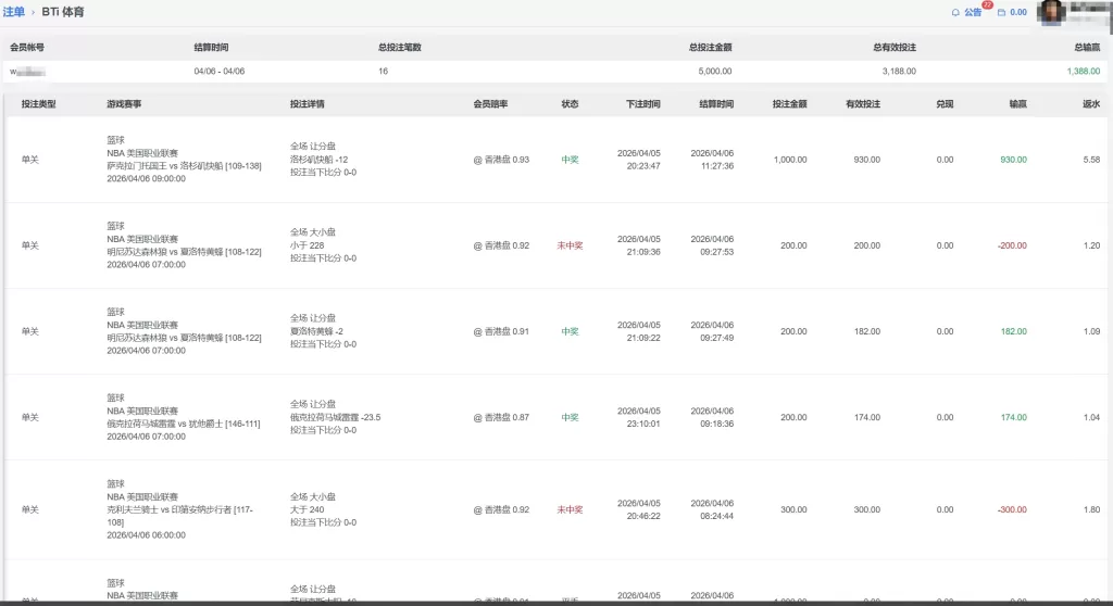 • BTi体育 会員w****篮求 单日盈利1388