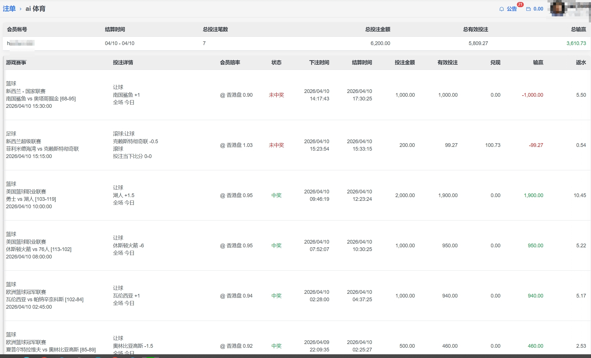 ai 体育 会員h***篮求 单日盈利3610