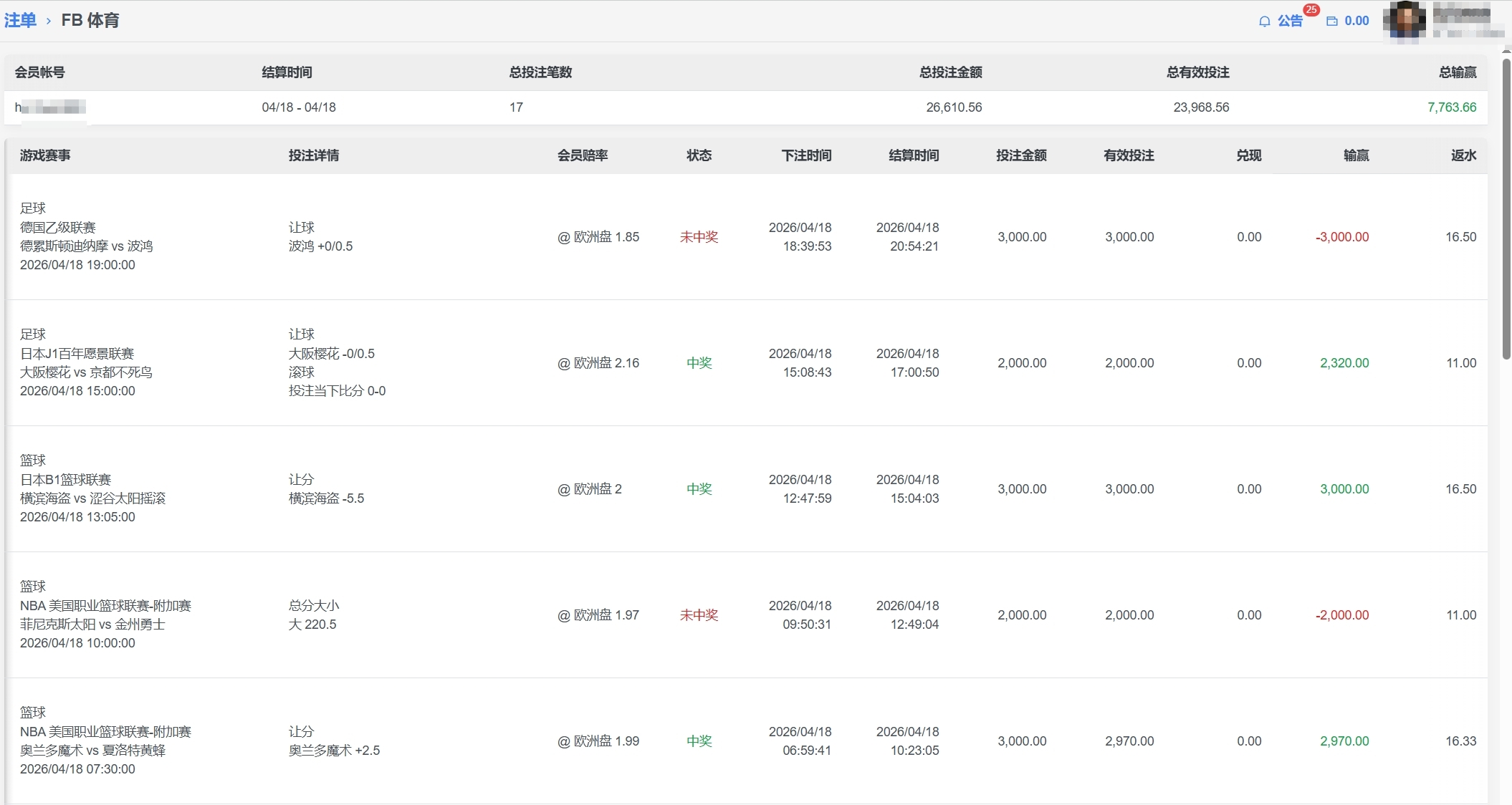 「2026/04/18」FB 体育 会員h****足求 单日盈利7763
