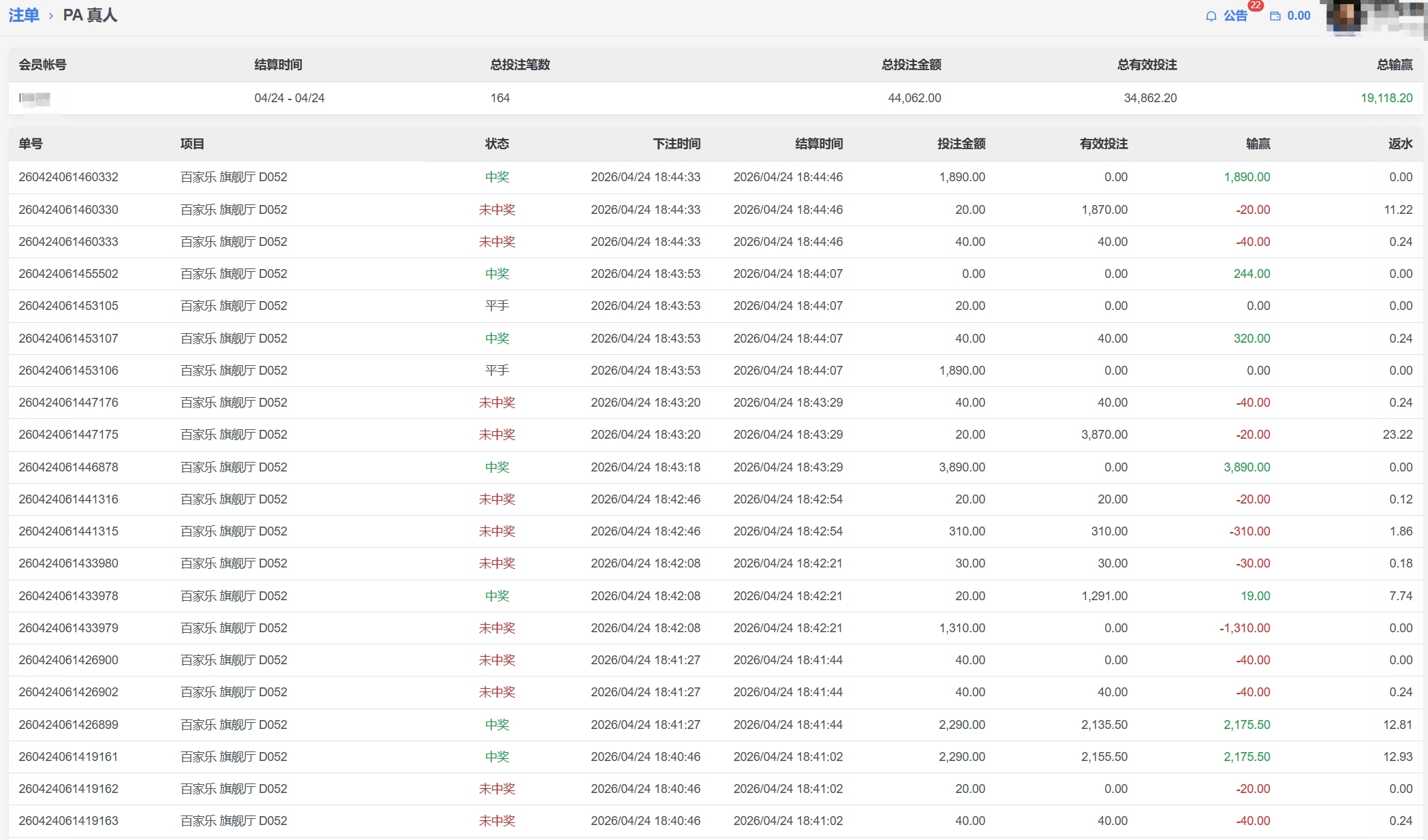 PA 真人 会員l****百家 单日盈利19118